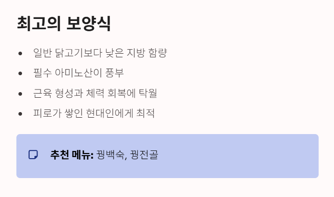 꿩고기는 특유의 담백한 맛이 있으며, 잡내가 거의 없어 누구나 부담 없이 즐길 수 있습니다. 특히 꿩백숙은 육수가 진하고 깊은 맛이 있어 밥과 함께 먹으면 최고의 보양식입니다. - 영양과 만족도