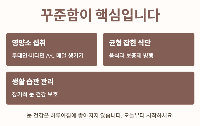 눈 건강은 하루아침에 좋아지지 않으므로, 꾸준한 영양 섭취와 생활 습관 관리가 핵심입니다.