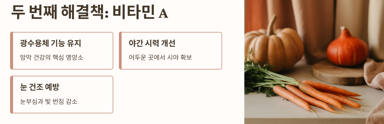 비타민 A는 눈 건강의 핵심 영양소로, 망막 기능 유지와 시력 보호에 필수적입니다. 특히 야간 시력 개선과 눈의 건조 예방에도 도움을 줍니다.