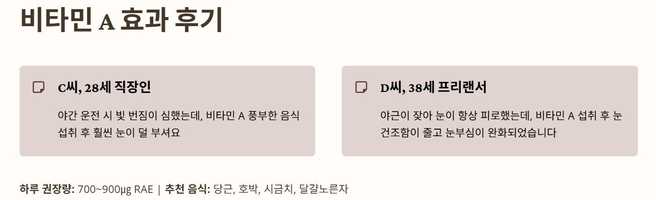 - D씨(38세, 프리랜서): “야근이 잦아 눈이 항상 피로했는데, 비타민 A 섭취 후 눈의 건조함이 줄고 모니터를 오래 봐도 눈부심이 완화되었습니다.”