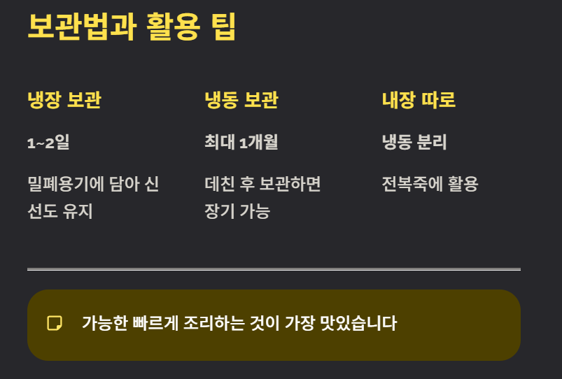 전복 내장은 비린 맛이 날 수 있으니 회로 드실 경우 제거하는 것을 추천하고, 전복죽을 끓일 때는 내장을 함께 넣으면 감칠맛이 더욱 진하게 올라옵니다.