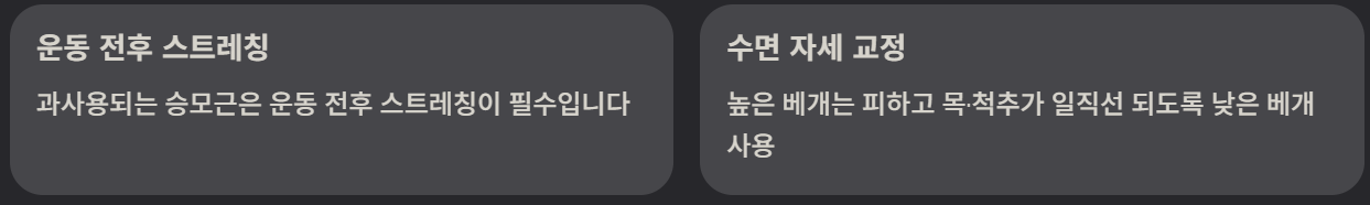 승모근 통증은 단순한 근육 뭉침처럼 보여도 대부분은 자세·스트레스·과사용 같은 생활 패턴에서 비롯됩니다. 원인을 정확히 파악하고 올바른 스트레칭과 근력 운동을 병행하면 통증을 빠르게 줄일 수 있습니다. 일상의 작은 개선이 큰 변화로 이어질 수 있다는 점을 기억하시기 바랍니다.