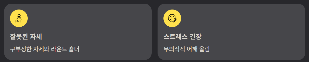 장시간 구부정한 자세는 승모근 통증의 가장 흔한 원인입니다. 특히 컴퓨터 모니터가 낮거나 스마트폰을 아래로 내려다보는 습관은 승모근 위쪽 부분을 지속적으로 긴장시켜 통증을 유발합니다. 어깨가 앞으로 말리는 라운드 숄더와 함께 나타나기도 합니다.