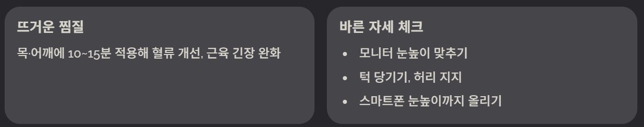 “하루 종일 데스크 작업을 하다 보니 승모근이 딱딱하게 굳었는데, 모니터 높이를 올리고 어깨 스트레칭을 자주 하니 통증이 절반 이상 줄었습니다.”