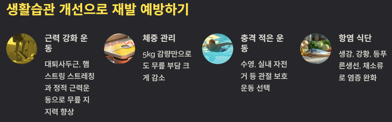 - “연골 손상 때문에 반복되었는데, 근력운동 병행하니 재발이 줄었다.”