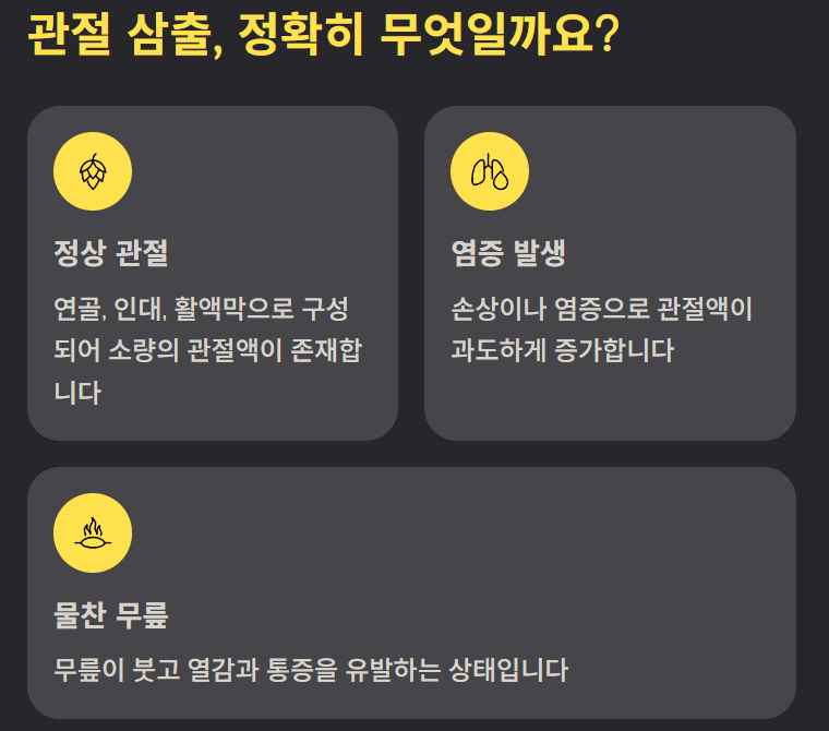 무릎 관절은 연골, 인대, 활액막으로 이루어져 있으며 관절이 부드럽게 움직이도록 소량의 **관절액(활액)**이 존재합니다. 그러나 염증이나 손상이 생기면 관절액이 과도하게 증가해 무릎이 붓고 열감과 통증을 유발하는데, 이것이 바로 **관절 삼출(물찬 무릎)**입니다.