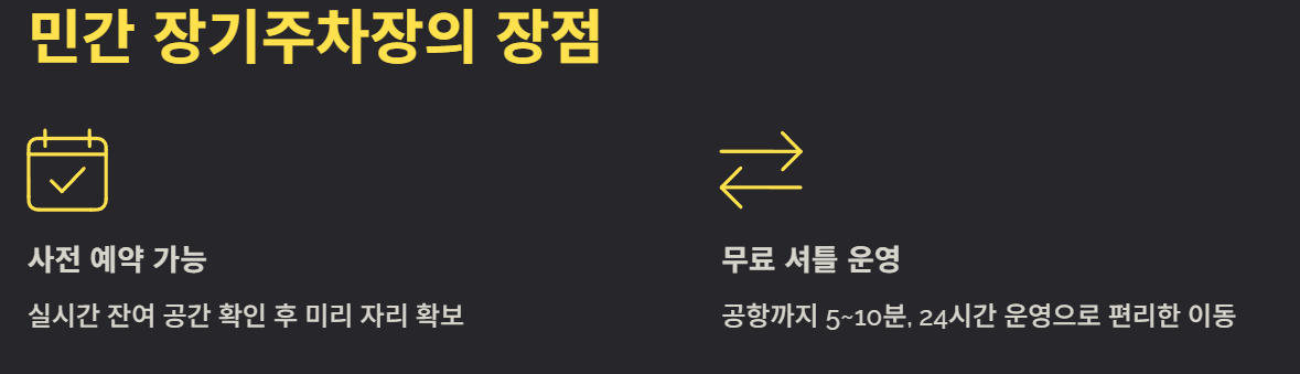 공항 근처(5~10분 거리)에 자리한 민간 장기주차장은 사전예약이 가능하고, 무료 셔틀 운영, 세차 서비스, 저렴한 장기요금 등이 강점입니다. 대부분 24시간 운영하며, 출국 시간에 맞춰 바로 공항으로 이동할 수 있어 편리합니다.