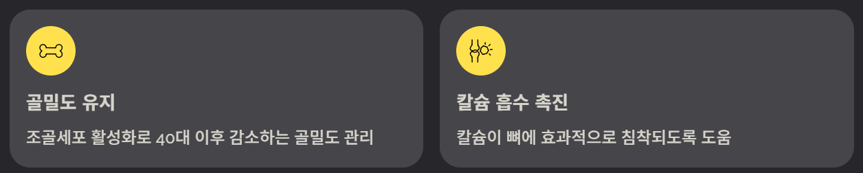 뼈 건강은 늦기 전에 미리 관리해야 하므로, 꾸준한 섭취와 생활 습관 개선을 함께 실천하면 더욱 좋은 결과를 기대할 수 있습니다.