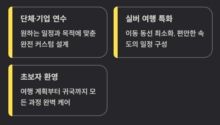 일정의 완성도, 가이드 전문성, 이동 편의성 등을 강화해 초보 여행객도 안심하고 이용할 수 있다는 장점이 있습니다.