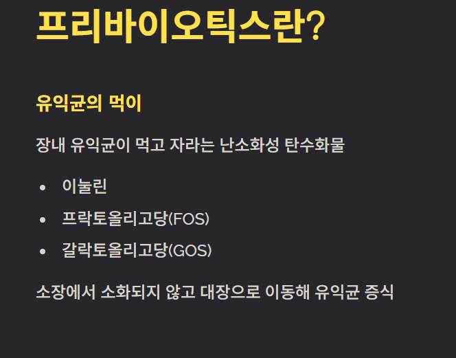 - 굳이 순서를 따진다면 프리바이오틱스 → 프로바이오틱스 (먹이를 먼저 공급)