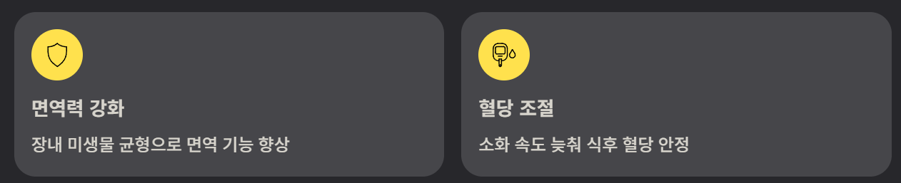 포만감을 오래 유지해 식욕 감소, 과식 방지에 도움을 줍니다. 장내 미생물 균형을 통해 대사 개선도 기대할 수 있습니다.