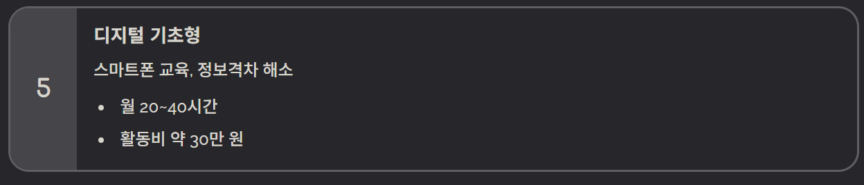 - 디지털 기초형(신규): 스마트폰 기초 교육, 정보격차 해소 목적 활동, 약 20~40시간, 약 30만 원 수준.