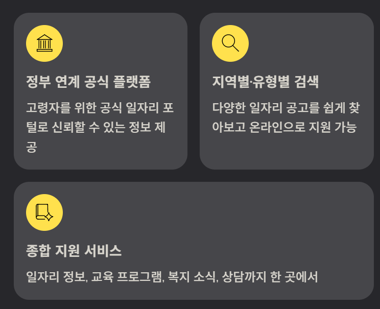 또한, 일자리 정보뿐 아니라 교육 프로그램, 복지 소식, 상담 안내 등 노년층의 사회 참여를 종합적으로 지원하는 기능도 제공됩니다.
