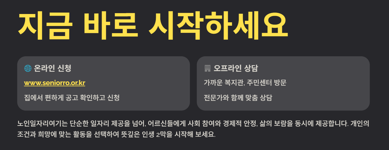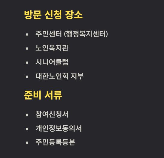 - 주민센터(행정복지센터), 노인복지관, 시니어클럽, 대한노인회 등 수행기관을 방문하여 상담 및 신청 가능.