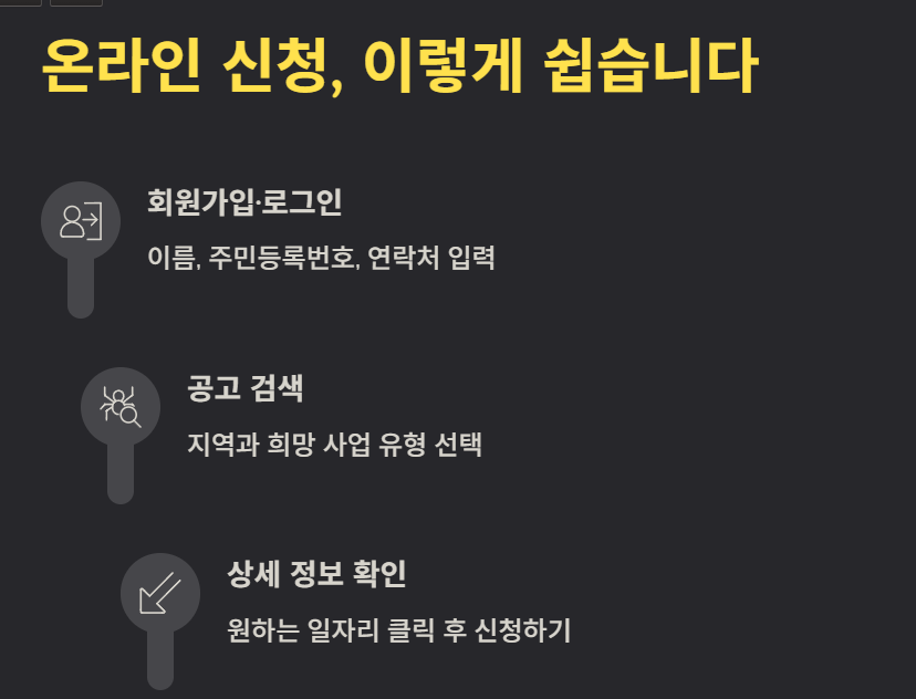 노인일자리여기를 통해 온라인으로 신청하는 절차는 비교적 직관적입니다.