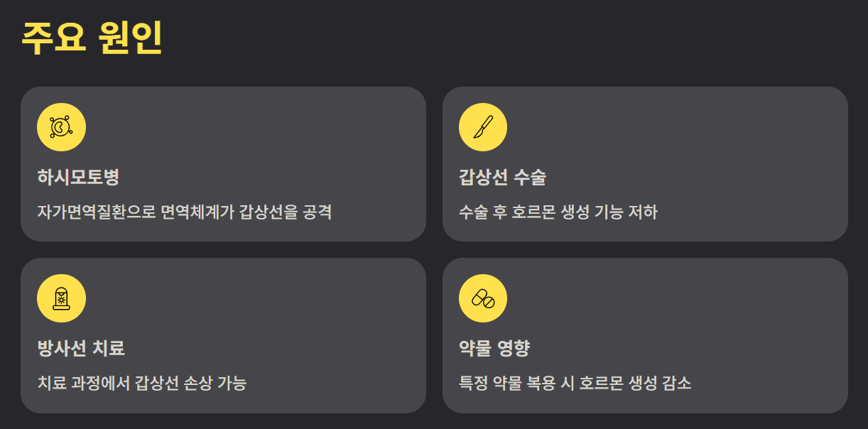 갑상선기능저하증은 여러 원인으로 발생할 수 있습니다. 가장 흔한 원인은 자가면역질환인 **하시모토병(Hashimoto’s thyroiditis)**으로, 면역체계가 갑상선을 공격해 호르몬 생성이 줄어듭니다. 이외에도 갑상선 수술, 방사선 치료, 특정 약물 복용, 요오드 결핍 등이 원인이 될 수 있습니다.