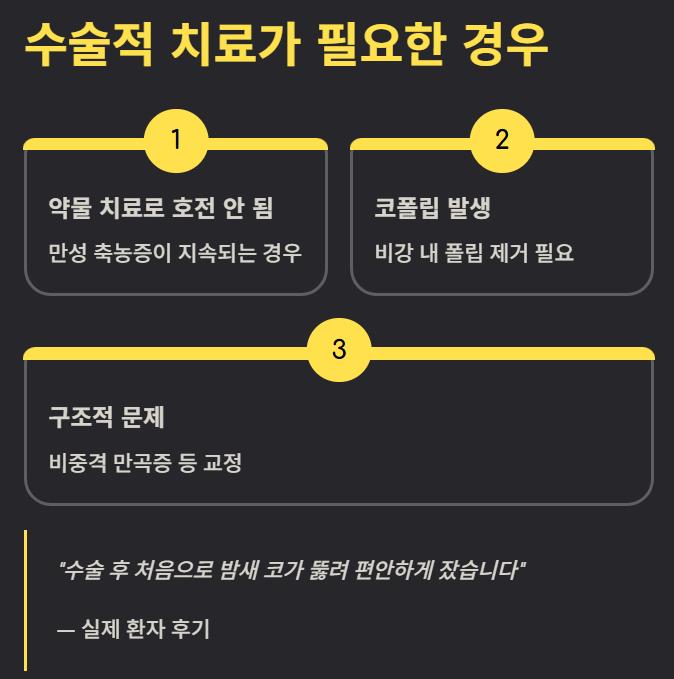 핵심 포인트: 원인 파악 → 약물/수술 치료 → 코 세척 및 생활습관 관리 → 재발 방지.