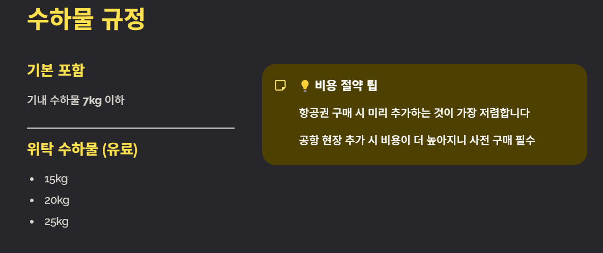 - 위탁 수하물 15kg·20kg·25kg 등 선택 가능(유료 추가)