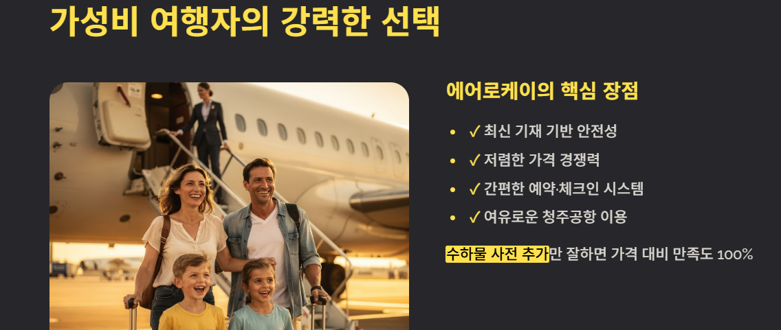 첫 해외여행, 단기 여행, 비용을 아끼는 여행자라면 에어로케이를 선택해보는 것을 강력히 추천드리며, 수하물 사전 추가만 잘한다면 **“가격 대비 만족도 100%”**라는 평가가 나올 만큼 괜찮은 선택이 될 것입니다.