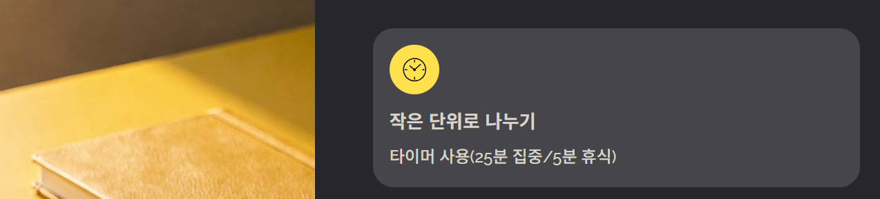 - 타이머 사용(25분 집중/5분 휴식)