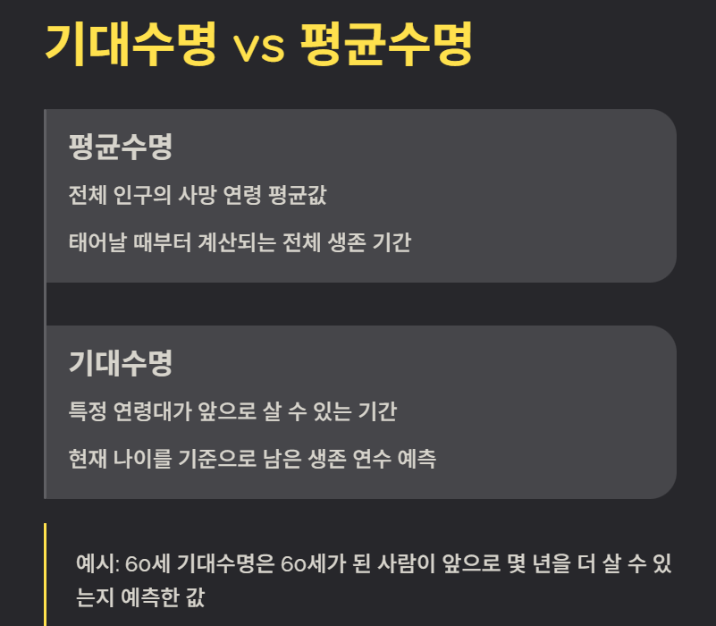 - 기대수명: 특정 연령대가 앞으로 몇 년을 더 살 수 있는지 예측한 수치