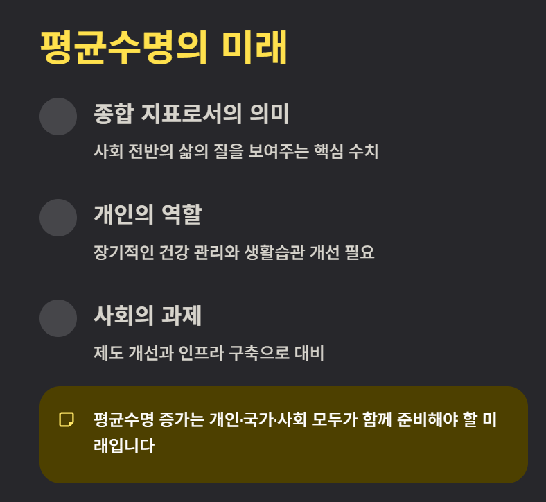 평균수명은 단순한 숫자가 아니라 사회의 전반적인 삶의 질을 나타내는 종합 지표입니다. 개인의 건강 관리뿐 아니라 국가 정책, 사회 시스템까지 영향을 끼치는 중요한 요소죠. 앞으로 평균수명은 계속 증가할 것으로 예상되는 만큼, 개인과 사회 모두 장기적인 건강 관리 및 제도 개선에 관심을 가져야 합니다.