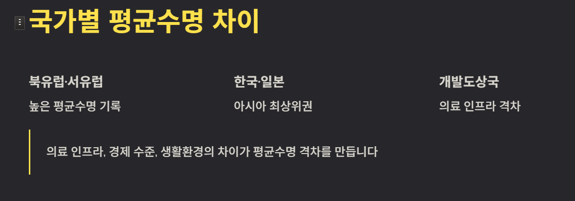 평균수명은 지역마다 매우 다르게 나타납니다. 북유럽·서유럽·한국·일본 등은 평균수명이 높은 반면, 개발도상국이나 분쟁 지역은 낮은 편입니다. 이는 의료 인프라, 경제 수준, 생활환경의 차이에 의해 발생합니다.