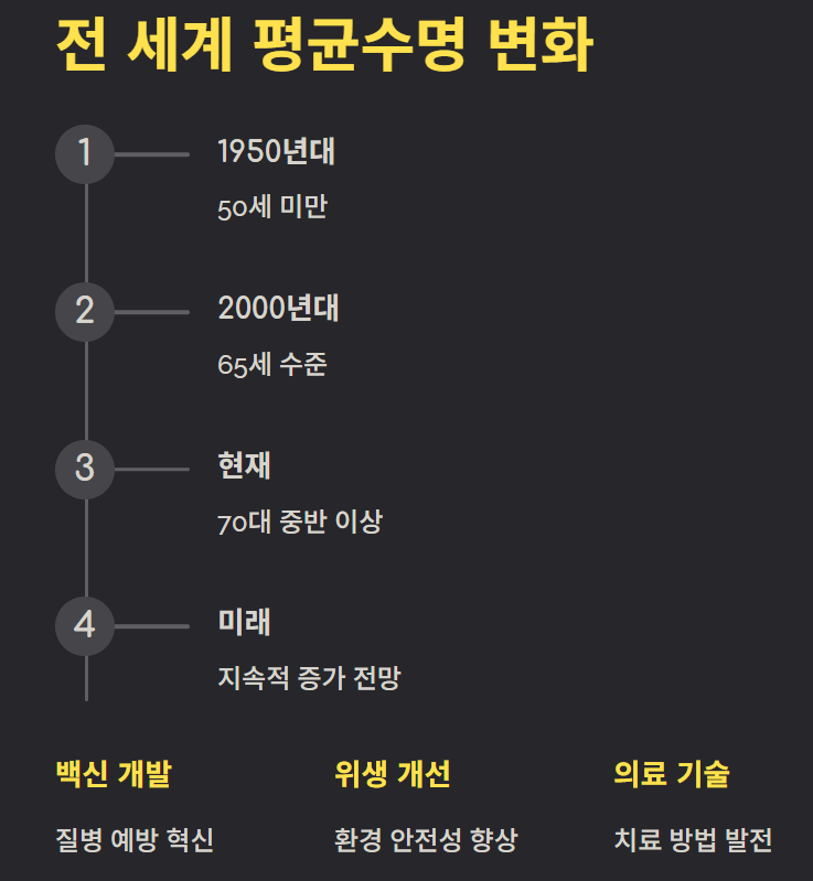 과거 1950년대에는 전 세계 평균수명이 50세를 넘기지 못했으나, 현재는 70세 중반 이상을 기록합니다. 백신, 항생제, 위생 개선, 산업 기술의 발전이 평균수명을 크게 끌어올린 것이죠. 앞으로도 의료 기술 향상으로 평균수명은 더 늘어날 가능성이 높습니다.