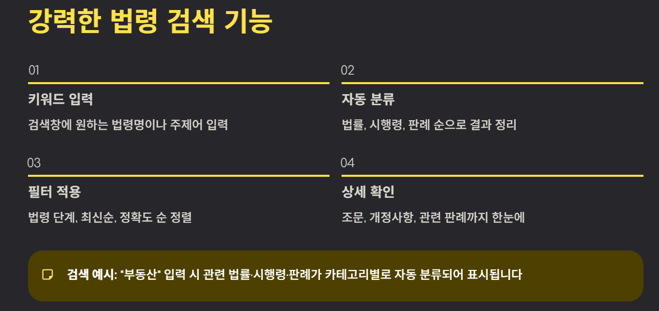 - “부동산” 검색 → 관련 법률, 시행령, 판례 순으로 정리