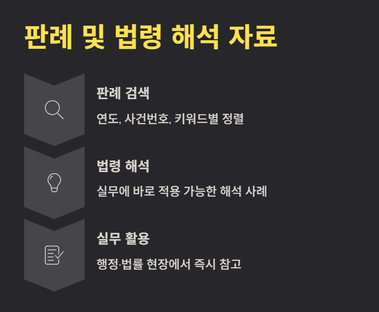 법령만 확인하는 것이 아니라 판례, 법령해석 정보도 제공합니다. 판례는 연도·사건번호·키워드별로 정렬할 수 있고, 법령해석 사례는 실제 행정·법률 실무에서 자주 참고하는 자료로 구성되어 있어 현장에서 매우 유용합니다.