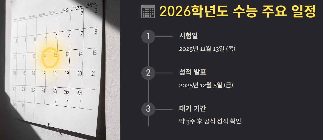 - 2026학년도 수능은 **2025년 11월 13일(목)**에 시행되었습니다.