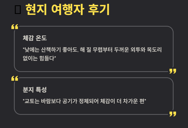 여행자들은 **“낮에는 산책하기 좋아도, 해 질 무렵부터 두꺼운 외투와 목도리 없이는 힘들다”**는 후기가 많습니다. 특히 교토는 분지 특성상 바람보다 공기가 정체되어 체감이 더 차가운 편이라는 의견도 있어요.