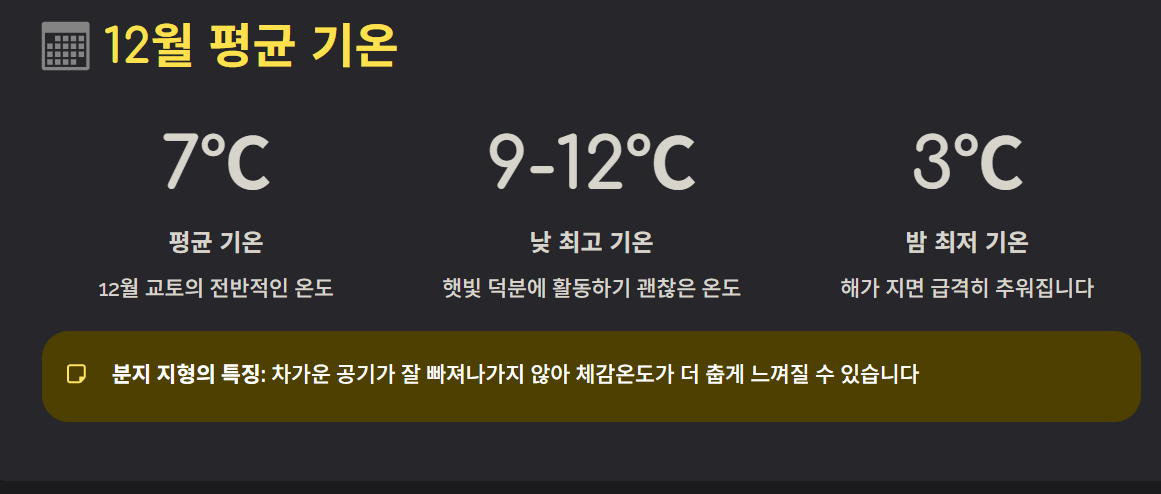 12월 교토의 평균 기온은 약 7℃ 정도이며, 낮에는 약 9~12℃, 밤에는 **약 3℃**까지 떨어집니다. 여러분이 느끼는 체감 온도는 실제보다 더 춥게 느껴질 수 있습니다. 이는 교토가 분지 지형이라 한 번 차가운 공기가 내려오면 잘 빠져나가지 않기 때문입니다.