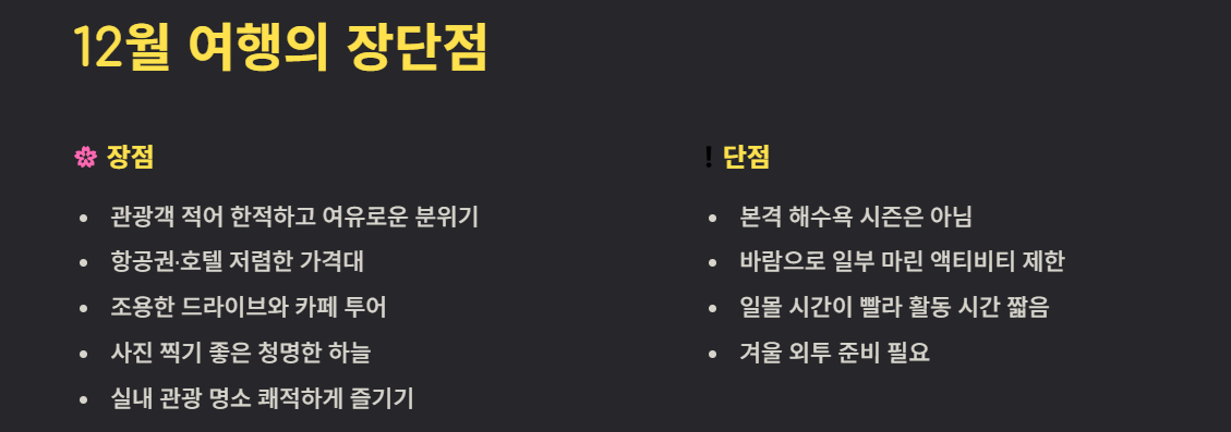 💡 오키나와 12월 날씨는 관광에 매우 적합하면서도 해수욕이나 극성수기 여행 분위기는 아닙니다.