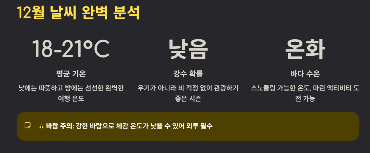 “12월 초는 아직 바다 스노클링 가능했고, 관광 인파 없이 고요한 풍경을 즐겼다.” (여행기)