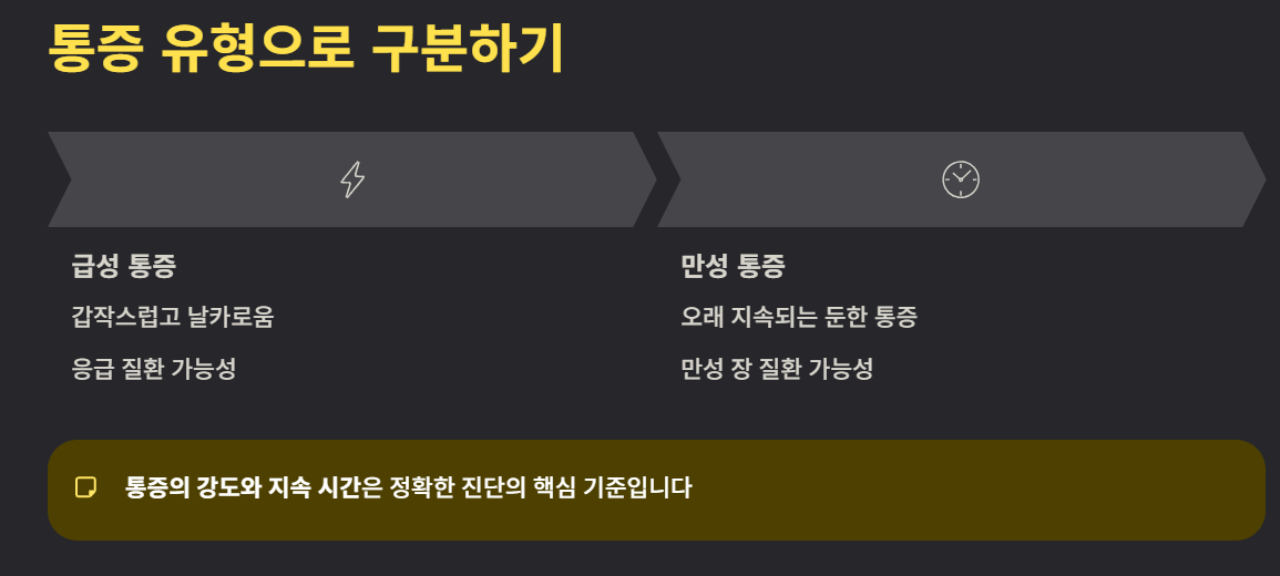 통증의 강도와 지속 시간은 진단의 중요한 기준입니다.