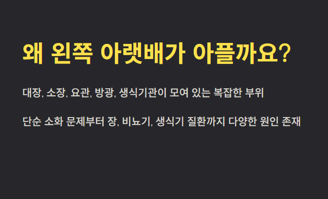 왼쪽 아랫배에는 대장, 소장, 요관, 방광, 생식기관 등이 위치해 있습니다. 이 부위에 통증이 발생하면 장 문제일 가능성이 높지만, 성별과 나이에 따라 원인이 달라질 수 있습니다.