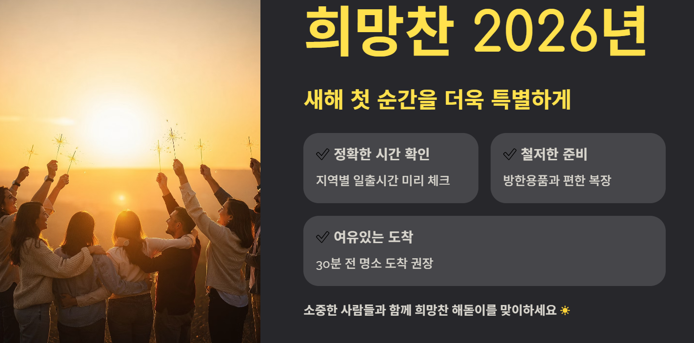 1월 1일 일출은 단순한 자연현상이 아니라 새로운 시작을 상징합니다. 매년 수많은 사람들이 새해 첫 해를 보며 건강, 성공, 행복을 기원합니다. 이 때문에 1월 1일 일출시간 알아보기는 연말연시 가장 많이 검색되는 키워드 중 하나입니다.