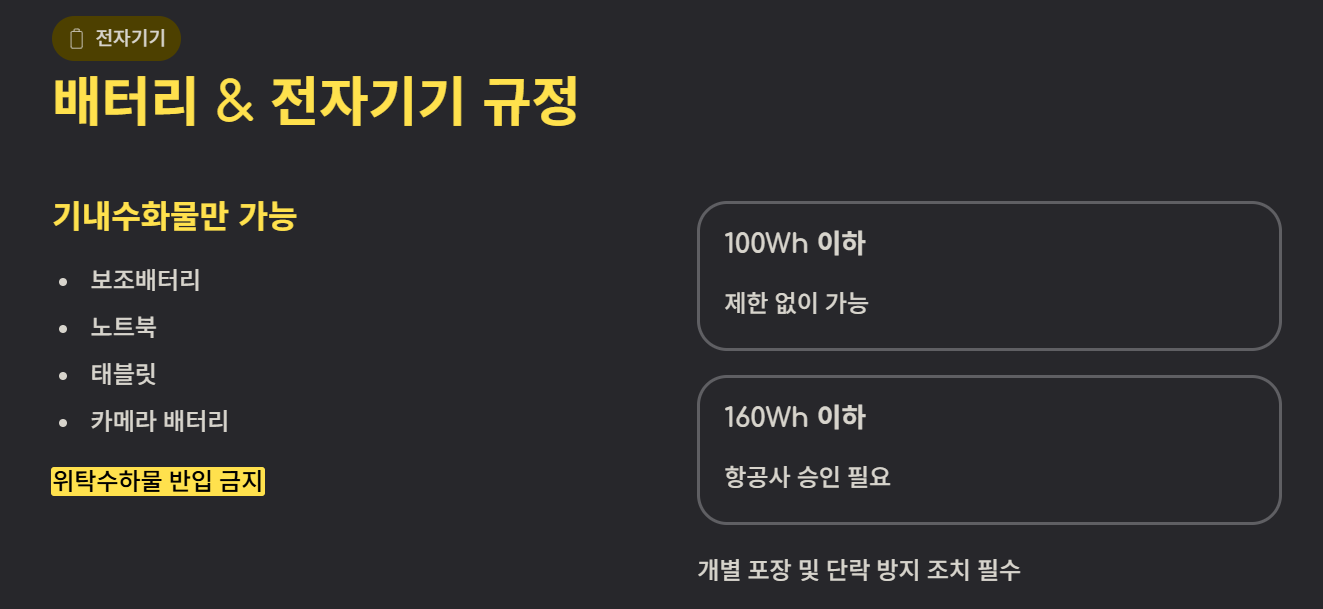 보조배터리, 노트북, 태블릿은 기내수화물만 가능합니다. 위탁수하물에 넣으면 안 됩니다.