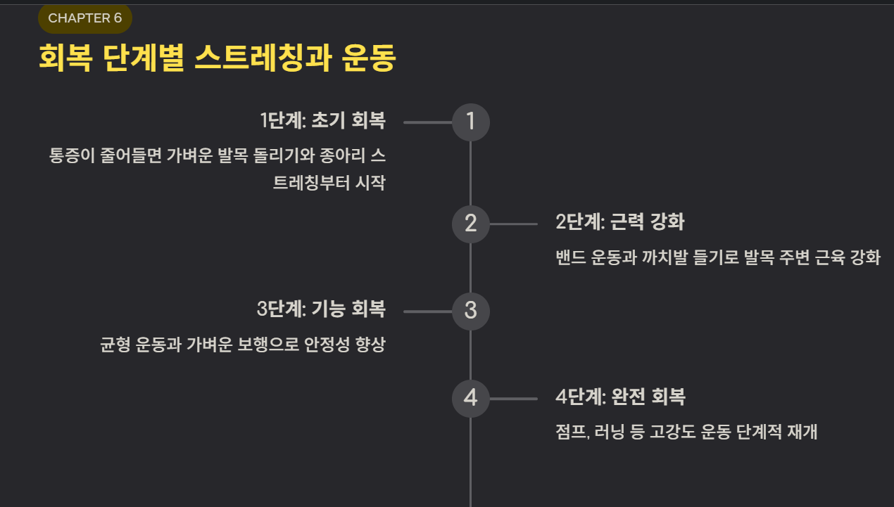 통증이 줄어들면 가벼운 발목 돌리기, 종아리 스트레칭부터 시작합니다. 이후 밴드 운동, 까치발 들기 등으로 근력을 강화하면 재발 예방에 효과적입니다. 무리한 점프나 러닝은 완전히 회복된 후 시작하세요.