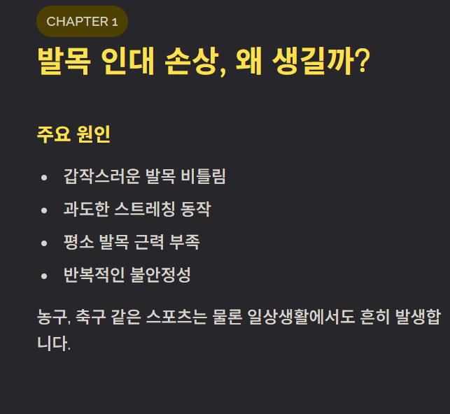 발목 인대는 관절을 안정화하는 조직으로, 갑작스러운 비틀림이나 과도한 스트레칭 시 늘어나거나 미세 파열이 생깁니다. 농구·축구 같은 스포츠뿐 아니라 일상생활에서도 흔히 발생합니다. 특히 평소 발목 근력이 약하거나 불안정성이 있는 경우 위험이 커집니다.