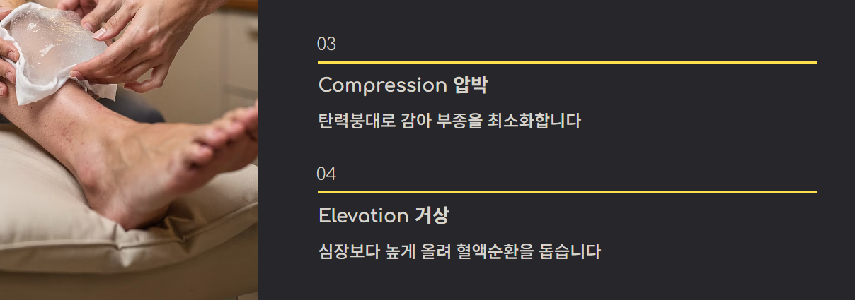 가장 기본이 되는 발목 인대 늘어났을 때 치료방법은 RICE 요법입니다.