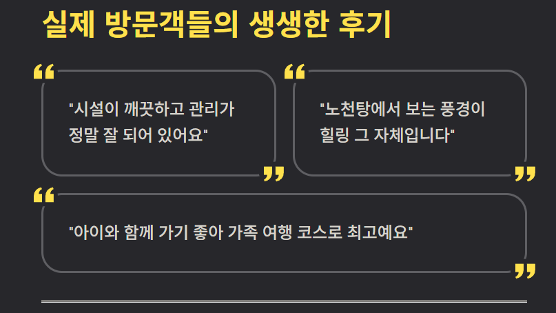 실제 방문객 후기에서는 “시설이 깨끗하고 관리가 잘 되어 있다”, “노천탕에서 보는 풍경이 힐링 그 자체”, “아이와 함께 가기 좋아 가족 여행 코스로 최고”라는 평가가 많습니다. 특히 온천수의 부드러움과 직원들의 친절함에 만족했다는 의견이 많아 재방문 의사가 높다는 점이 인상적입니다.