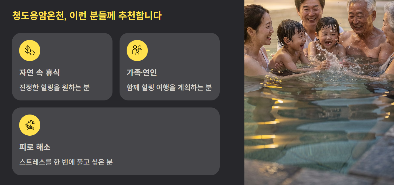 청도용암온천은 자연 속에서 진정한 휴식을 원하는 분, 가족·연인과 함께 힐링 여행을 계획하는 분, 피로와 스트레스를 한 번에 풀고 싶은 분들에게 적극 추천할 만한 곳입니다. 다양한 시설과 편리한 이용 방법, 좋은 후기까지 갖춘 청도 대표 온천 명소이니 청도 여행을 계획 중이라면 꼭 일정에 포함해 보시길 바랍니다.
