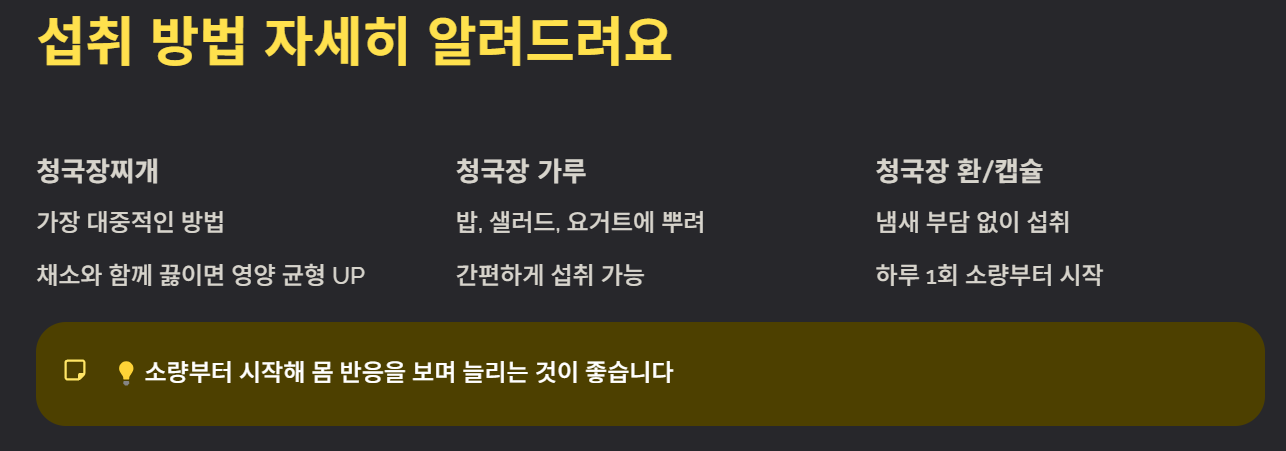 - 청국장 가루: 밥, 샐러드, 요거트에 뿌려 간편 섭취