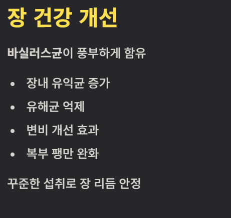 발효 과정에서 생성되는 효소와 아미노산이 면역세포 활성화를 도와 감기나 잔병치레를 줄이는 데 도움이 됩니다. 환절기나 체력이 떨어질 때 특히 좋습니다.