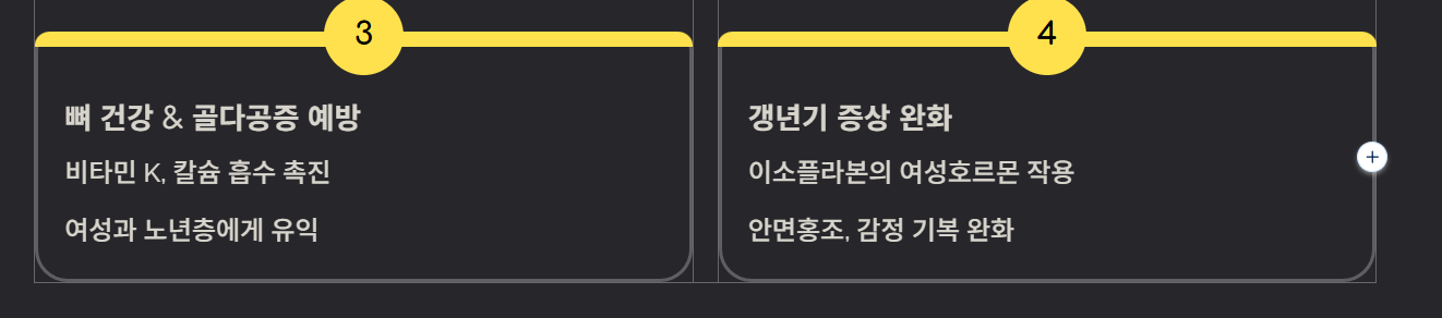 비타민 K, 칼슘 흡수를 돕는 성분이 들어 있어 뼈 밀도 유지에 도움을 줍니다. 특히 여성과 노년층에게 유익합니다.