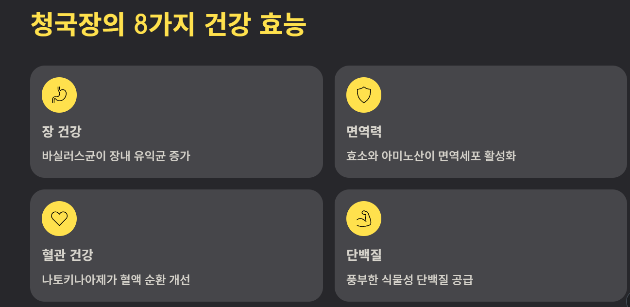 청국장은 장 건강, 면역력, 혈관 건강, 다이어트까지 한 번에 챙길 수 있는 전통 발효 건강식품입니다. 처음엔 냄새가 부담될 수 있지만, 꾸준히 섭취하면 몸의 변화를 느낄 수 있는 식품이니 다양한 방법으로 시도해보세요. 건강을 자연스럽게 관리하고 싶은 분들께 적극 추천드립니다.