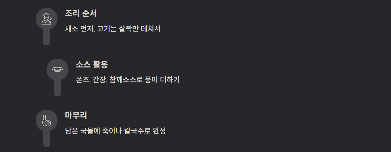 국물이 끓기 시작하면 채소 → 고기 순으로 넣어 익히는 것이 좋습니다. 고기는 오래 끓이지 말고 살짝 데쳐 부드럽게 드세요. - 소스 활용