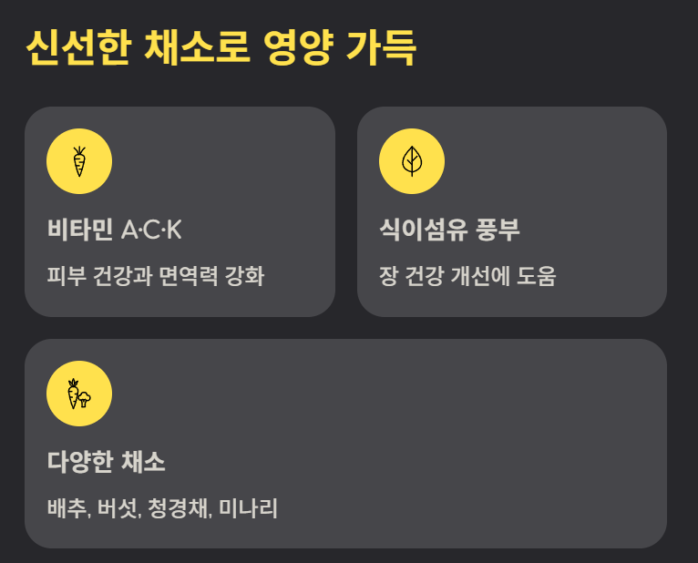 배추, 청경채, 버섯, 숙주, 미나리 등 다양한 채소가 들어가 비타민 A, C, K와 식이섬유를 한 번에 섭취할 수 있습니다. 이는 피부 건강과 면역력 강화에 도움을 주며 장 건강 개선에도 긍정적인 영향을 줍니다.